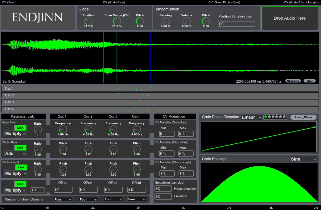 Endjinn is a synchronous four oscillator granular synthesiser, each generating between 1-4 overlapping grain streams. CV (control voltage) from any of the BEAP devices can be used to scan grain playback over a sound file in any pattern or direction. CV can also control grain rate and a pitch multiplier for all oscillators. The usual granular parameters are present – random pitch, position and volume per grain. Unusually for a granulator, grain rate can also be very slow – down to 0.1hz and through to 100hz, so you can effectively create slowly cross-faded soundscapes. Phase distortion can be applied to the playback of individual grains, with user-defined shapes. Similarly, the grain envelope can be designed within the synth or loaded in as a separate sound file. Pitch and rate parameters can be ganged together for fast tweaking and setting at precision increments.